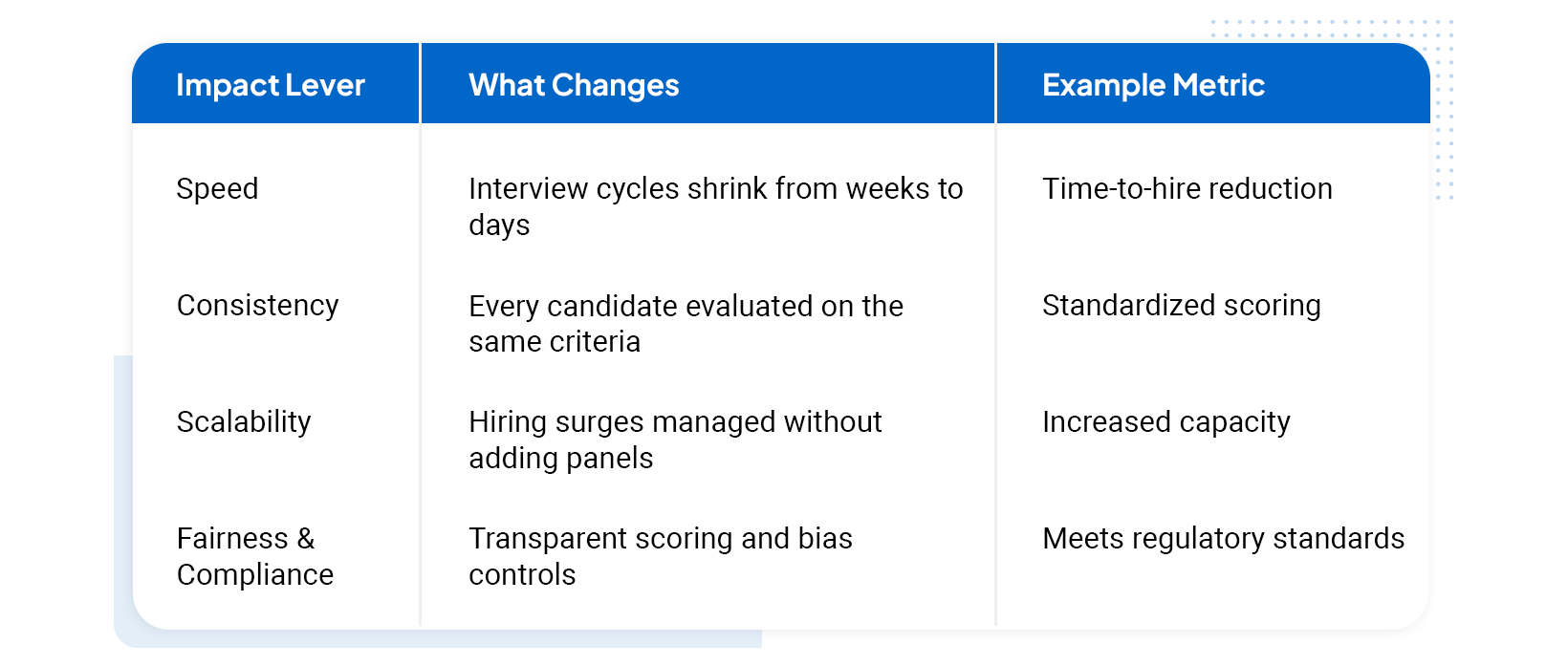 Structured AI-led interviews do more than speed up one stage. They influence several dimensions of hiring performance: